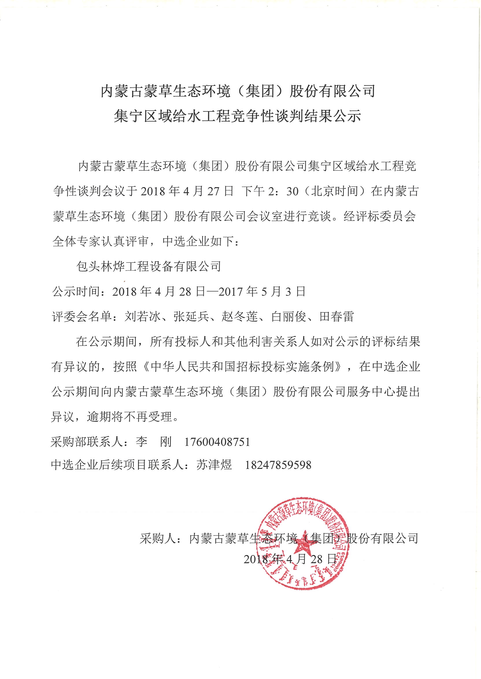 內(nèi)蒙古蒙草生態(tài)環(huán)境(集團)股份有限公司集寧區(qū)域給水工程競爭性談判會議于2018年4月27日 下午2:30(北京時間)在內(nèi)蒙古蒙草生態(tài)環(huán)境(集團)股份有限公司會議室進行競談。經(jīng)評標委員會全體專家認真評審,中選企業(yè)如下: