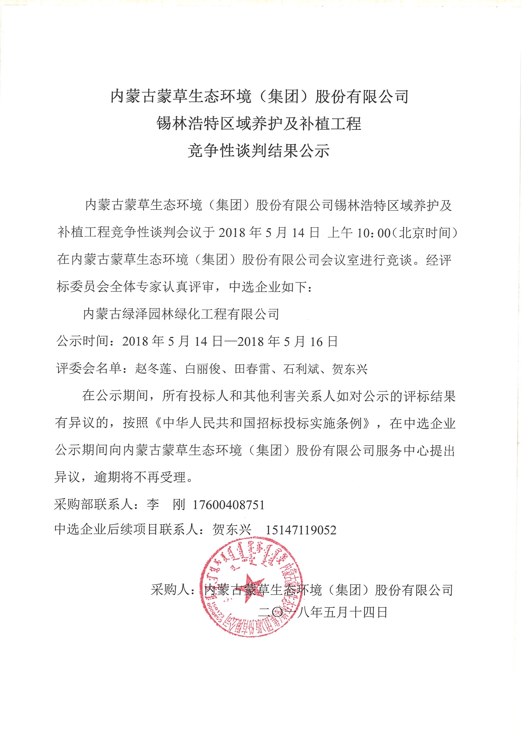 內(nèi)蒙古蒙草生態(tài)環(huán)境(集團(tuán))股份有限公司錫林浩特區(qū)域養(yǎng)護(hù)及補(bǔ)植工程競(jìng)爭(zhēng)性談判會(huì)議于2018514 上午1000(北京時(shí)間)在內(nèi)蒙古蒙草生態(tài)環(huán)境(集團(tuán))股份有限公司會(huì)議室進(jìn)行競(jìng)談。經(jīng)評(píng)標(biāo)委員會(huì)全體專家認(rèn)真評(píng)審,中選企業(yè)如下: