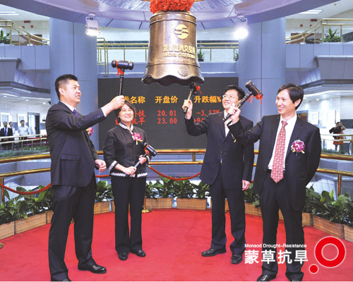 9月27日上午9時(shí)25分,公司董事長(zhǎng)王召明敲響深圳證券交易所上市寶鐘,內(nèi)蒙古和信園蒙草抗旱綠化股份有限公司在深圳證券交易所首發(fā)A股股票并在創(chuàng)業(yè)板成功上市,股票簡(jiǎn)稱“蒙草抗旱”,股票代碼“300355”。公司股票開(kāi)盤(pán)表現(xiàn)強(qiáng)勁,大漲94.92%,創(chuàng)出了今年深交所新股上市首日最大漲幅。