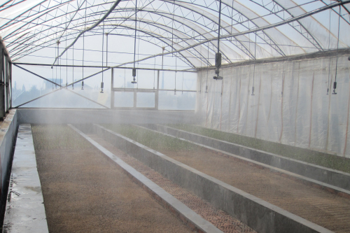 前不久,扦插苗床在抗旱植物研究院正式落成。該苗床位于連棟溫室西南角,占地面積90平方米,內(nèi)置3個獨立苗床,為全光照噴霧扦插苗床,每個苗床約15平方米,按照6*8cm的株行距,最大可同時扦插育苗12000株。噴頭采用了市場中現(xiàn)行霧化效果較好的十字霧化噴頭,外接智能定時控制器,保障了苗木能在較適宜的溫濕度環(huán)境中生根發(fā)芽。扦插苗床在抗旱植物研究院的落成,進一步提高了公司扦插繁殖效率。