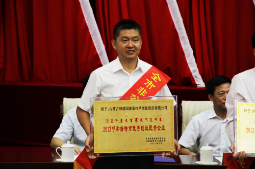 8月23日,呼和浩特市在市政府召開(kāi)非公有制經(jīng)濟(jì)工作會(huì)議并對(duì)全市10戶優(yōu)秀本土民營(yíng)企業(yè)、10戶優(yōu)秀外來(lái)投資民營(yíng)企業(yè)和10戶優(yōu)秀創(chuàng)業(yè)民營(yíng)企業(yè)進(jìn)行了表彰,蒙草抗旱獲“2013呼和浩特市優(yōu)秀創(chuàng)業(yè)民營(yíng)企業(yè)”榮譽(yù)稱號(hào)。
