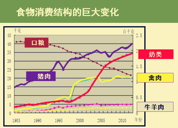 食物消費結構的巨大變化,口糧在下降。1990-2012,人均口糧下降38%,人均肉、奶上升26%??诩Z來源于作物,肉奶來源于家畜。2002年,人均口糧232公斤,口糧3億噸,飼料糧2 億噸。2020年,隨著食物結構的改善,我國口糧與飼料糧3:2的模式將會發(fā)生變化:口糧占的比例將會下降,飼料逐步增加,比例變?yōu)?:5。
