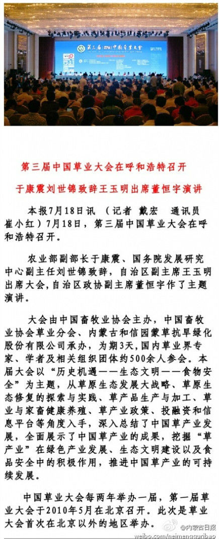 第三屆中國(guó)草業(yè)大會(huì)是內(nèi)蒙古有史以來(lái)規(guī)格最高的一次會(huì)議,國(guó)內(nèi)草業(yè)80%以上的部門負(fù)責(zé)人、專家、企業(yè)都出席了本次活動(dòng)。內(nèi)蒙古作為國(guó)內(nèi)的一個(gè)草原大省,草原生態(tài)是內(nèi)蒙古的戰(zhàn)略目標(biāo),本次會(huì)議可以看作是草產(chǎn)業(yè)和生態(tài)的一次有機(jī)結(jié)合,將有利于下一步科學(xué)的發(fā)展草原生態(tài)產(chǎn)業(yè)。