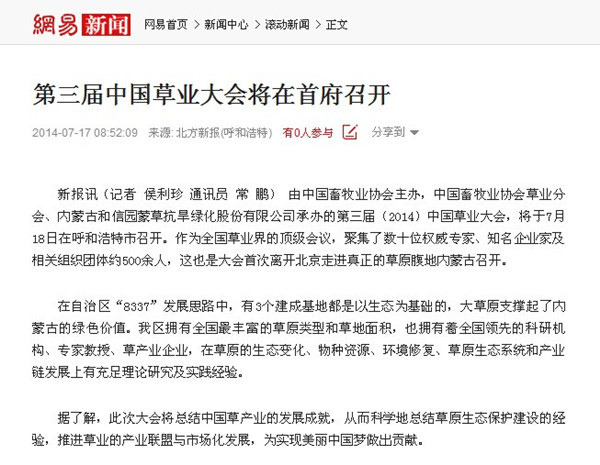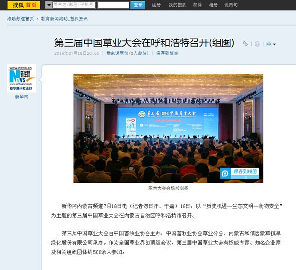 本屆草業(yè)大會(huì)不僅吸引了眾多頂級(jí)專家、知名企業(yè)家及相關(guān)組織團(tuán)體,還引起了廣大媒體的高度關(guān)注:內(nèi)蒙古電視臺(tái)、內(nèi)蒙古人民廣播電臺(tái)、新華網(wǎng)進(jìn)行了專題報(bào)道;搜狐網(wǎng)、網(wǎng)易、鳳凰網(wǎng)等多家門戶網(wǎng)站就會(huì)議內(nèi)容進(jìn)行了報(bào)道;內(nèi)蒙古日?qǐng)?bào)、經(jīng)濟(jì)觀察報(bào)整版刊登了蒙草公司承辦大會(huì)的相關(guān)內(nèi)容;正北方網(wǎng)作為日點(diǎn)擊超過(guò)1300萬(wàn)次的內(nèi)蒙古第一門戶網(wǎng)站也對(duì)大會(huì)進(jìn)行了全程直播。