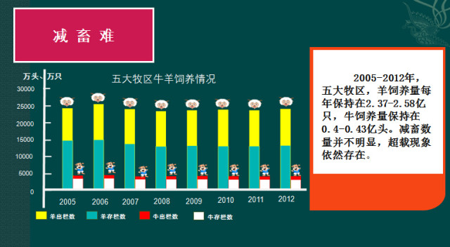 一個(gè)硬骨頭是減畜困難。從2005年到2012年我國(guó)的五大牧區(qū),羊的適養(yǎng)量每年均保持在2.4%到2.6%左右,牛的適養(yǎng)量也是在0.4—到0.43億頭左右。減畜的數(shù)量并不是很明顯,好在我們的牧場(chǎng)產(chǎn)量在增加,所以我們的載畜量還是有所下降的。