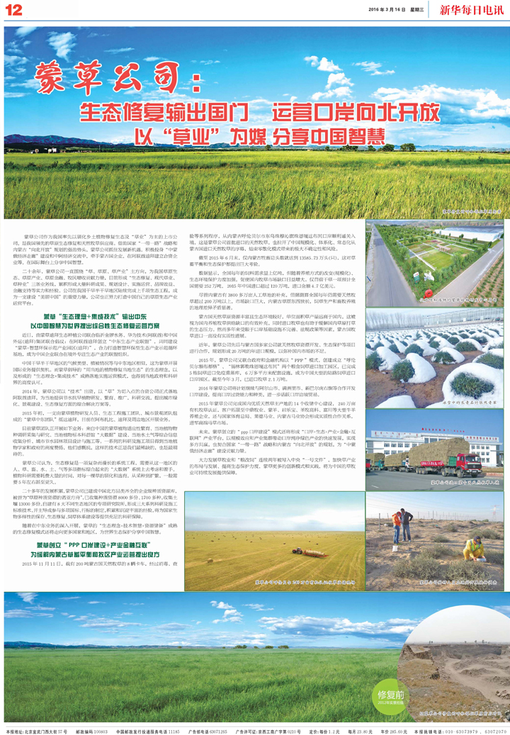 適逢2016全國兩會召開,有“一報(bào)在手,便知天下”美譽(yù)之稱,全國日發(fā)行超160萬份的《新華每日電訊》刊報(bào)蒙草公司在生態(tài)修復(fù)、草牧產(chǎn)業(yè)、對外合作、發(fā)展創(chuàng)新等方面的經(jīng)驗(yàn)。蒙草小編特摘編如下,與大家分享:
