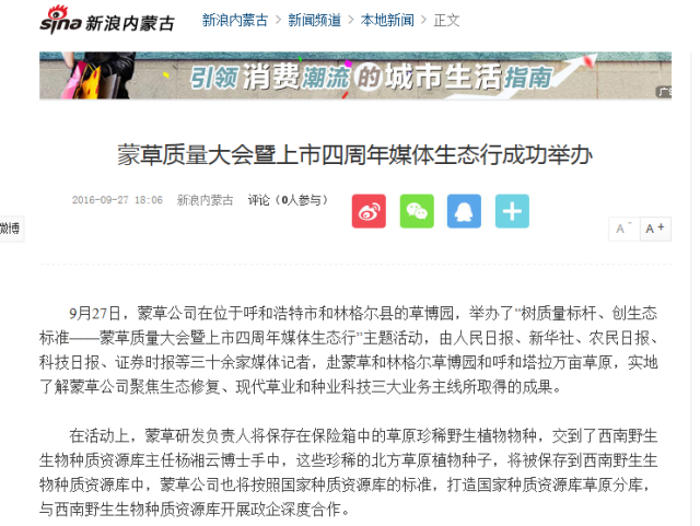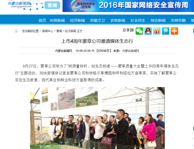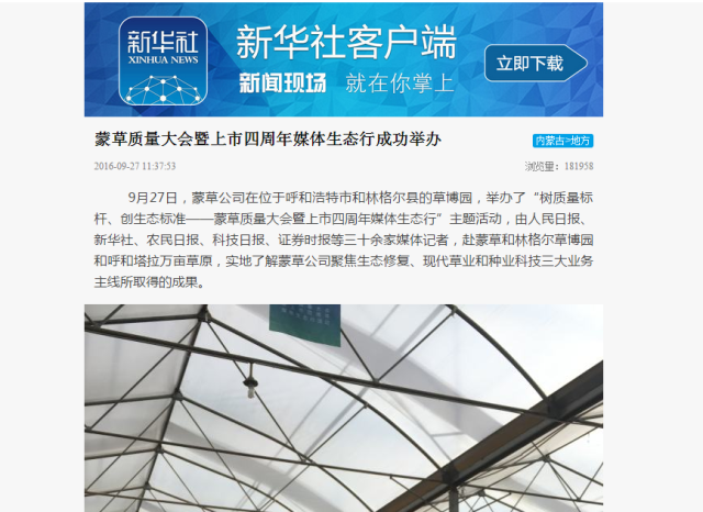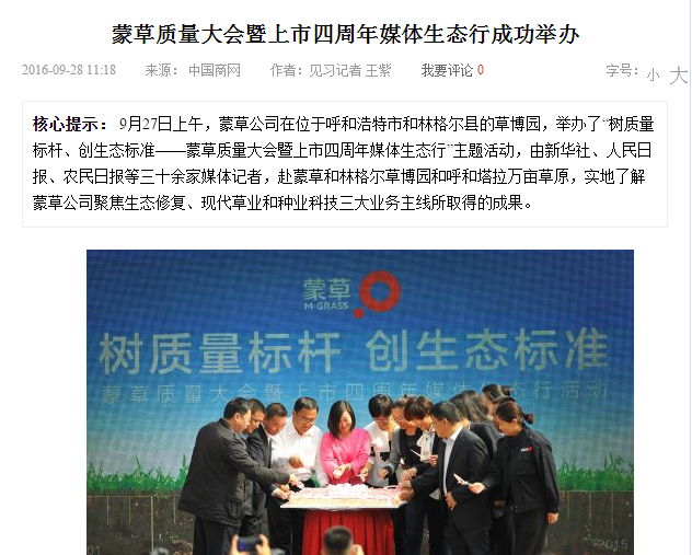 2016年9月27日,以“樹質(zhì)量標(biāo)桿、創(chuàng)生態(tài)標(biāo)準(zhǔn)”為主題的蒙草質(zhì)量大會(huì)暨上市四周年媒體生態(tài)行活動(dòng)在蒙草草原鄉(xiāng)土植物館拉開帷幕。活動(dòng)期間,全國四十余家媒體記者共赴蒙草和林格爾草博園和呼和塔拉萬畝草原,實(shí)地了解蒙草公司聚焦生態(tài)修復(fù)、現(xiàn)代草業(yè)和種業(yè)科技三大業(yè)務(wù)主線所取得的成果。