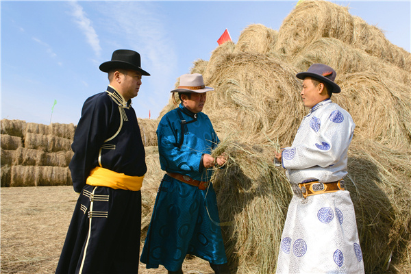 牧民在蒙草牧草收儲(chǔ)中心交談