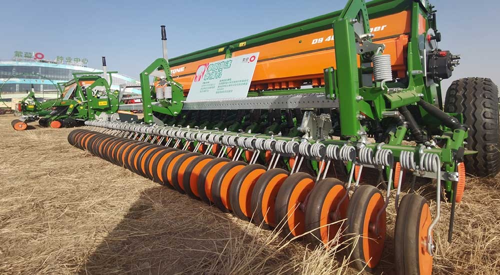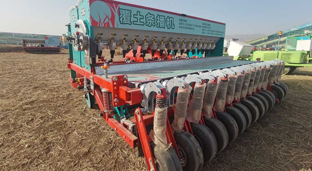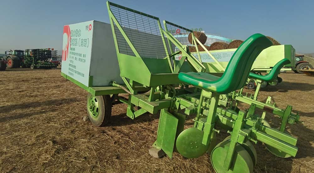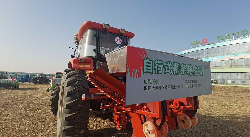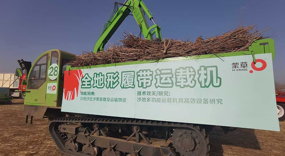 面積較大區(qū)域選用蒙草固沙機(自研)機械鋪設(shè)沙障。根據(jù)地形,利用蒙草固沙機一天可鋪設(shè)30—50畝高標準沙障