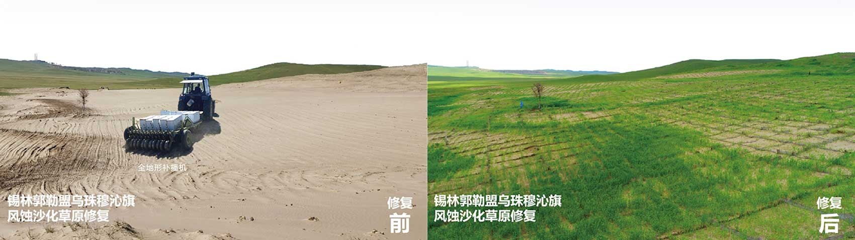 錫林郭勒盟烏拉蓋管理區(qū)哈拉蓋圖牧場1000畝重度沙化草原(風蝕坑),采用整地+設(shè)置沙障+補播灌草方法修復治理 三年后,植被平均高度達到36厘米,平均蓋度51%,地上生物量達130千克/畝。