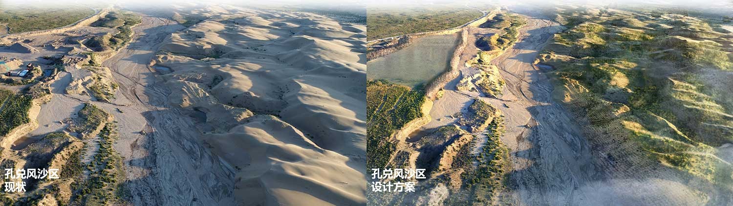 阿拉善盟阿拉善左旗、阿拉善右旗、額濟納旗,巴彥淖爾市烏拉特后旗、磴口縣,鄂爾多斯市烏審旗、達拉特旗生態(tài)治理試驗示范5000畝。以風蝕段埋置機械沙障+沙漠邊緣地帶營造防護林+生物沙障+補植以灌木為主的植物組合(植物種的選擇與配比以當?shù)剜l(xiāng)土灌木植物為主)。