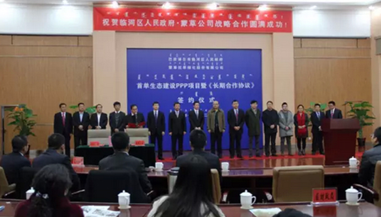 1月22日,巴彥淖爾市臨河區(qū)政府與蒙草公司聯(lián)合舉行首單生態(tài)建設(shè)PPP項目暨長期合作協(xié)議簽約儀式,臨河區(qū)區(qū)委書記李理與蒙草董事長王召明